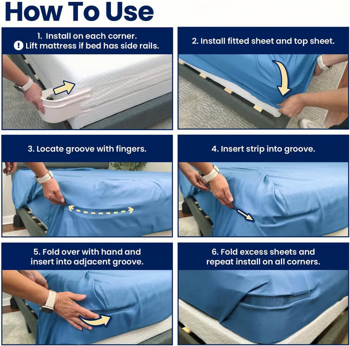 From fitted sheet holders for corners to sheet corner holders, works with all sheet types and sizes, even double sheets. Enjoy perfect sheet alignment